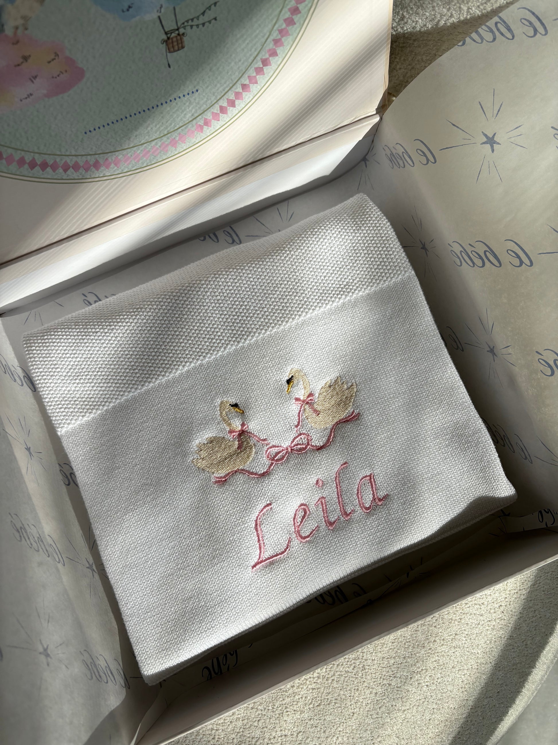 Celebrate the arrival of a new baby by personalising this white swans and bows baby blanket shawl with their name.